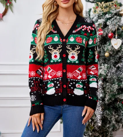 Fashionable knitted V-neck Christmas pattern single breasted long sleeved cardigan for autumn and winter women's casual sweater