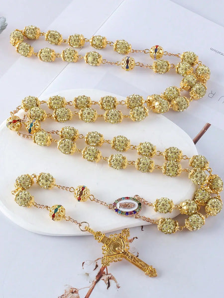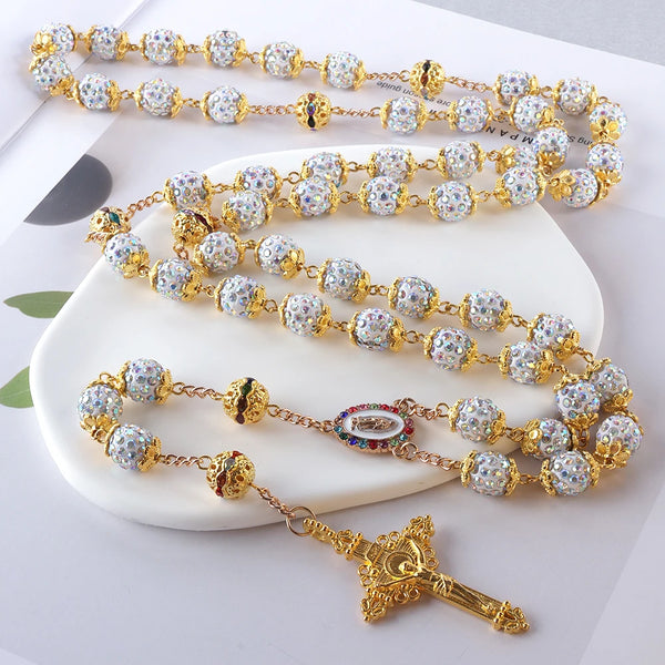 2025New Vintage Catholic 10mm 59 Crystal Rhinestone Beads Cross Necklace