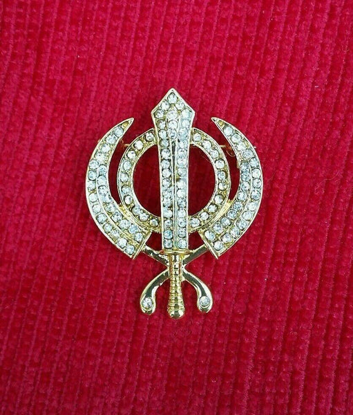 Don't miss out on this stunning Diamonte Gold Plated SIKH Khanda Brooch Cake Pin. Get yours today and elevate your style to the next level.