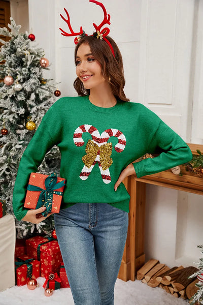 Sweater 2025 Autumn/Winter New Product Christmas Cane Bow Glitter Women's Fashion Round Neck Hooded Long Sleeve Knitted Sweater