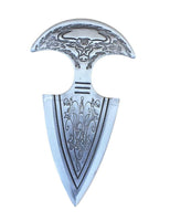Small Size is: approx. 13.5cm x 6.5cm (including sheath), approx. 13cm x 6.5cm just blade, Thickness of Blade is approx. 3mm; Weight approx. 132-148g (varies for each design)Handmade design, blades are engraved from both sides. Metal is Sarbloh. Please note Sarbloh is pure iron and there may be rust marks present and these require cleaning with sharp sand and treatment with coconut oil to avoid rust.