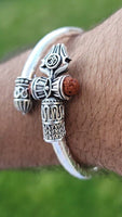 This is the same kara worn by world famous Japanese artist Mr. Kaze Fujii in Grace Live in Seoul, Korea, Design Ref: Y1 Evil Eye Protection Hindu Good Luck Bangle HAND MADE - EACH KARA design may slightly vary as these are assembled by different workers. Silver colour - Antique Affect - Silver Plated - Adjustable Size Kara Original Rudraksha Beads - Natural Rudraksha/Rudra beads - size may vary Mantras performed/Sidhi done by a Priest in Jalandhar. . * Healing Kada * meditation Kara * Medicinal/Health Benefits of wearing Rudraksha Beads bangle * Positive energy * Encouragement and Motivational ring * Evil Eye Protection * Good LuckPlease note these Kara are energised/blessed from a Shiv Temple in Jalandhar. Kara sizes are adjustable. It will fit all hands with Kara size from Small 6cm to XLarge 7.8cm. These will slip on sidewise straight on arm/wrist and are not worn through Knuckles. Only Kara per sale unless you add more quantity. Photos are for information purpose and to show details of the items. There may be a slight measuring error of 1mm as we measure rings with digital vernier callipers. Colour may slightly vary due to light and flash conditions. There may be slight scruff marks on some kara that are seen on all kara form Amritsar as these are transported in Jute bags in jumbles. Should you have any questions please do not hesitate to contact us. Stay blessed!