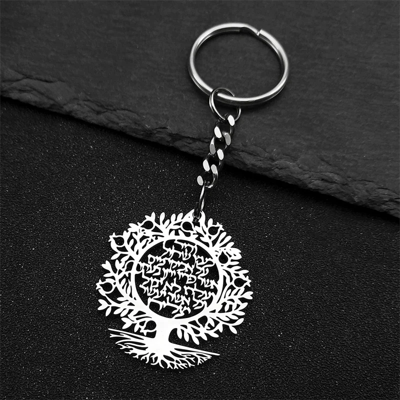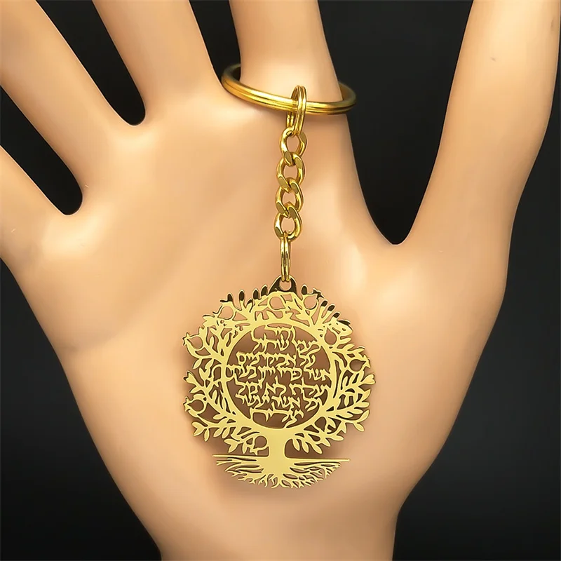 Tree of Life Hebrew Pendant Key Chain for Women Men Stainless Steel Gold Color Israel Jewish Hollow Drop Key Ring Amulet Jewelry