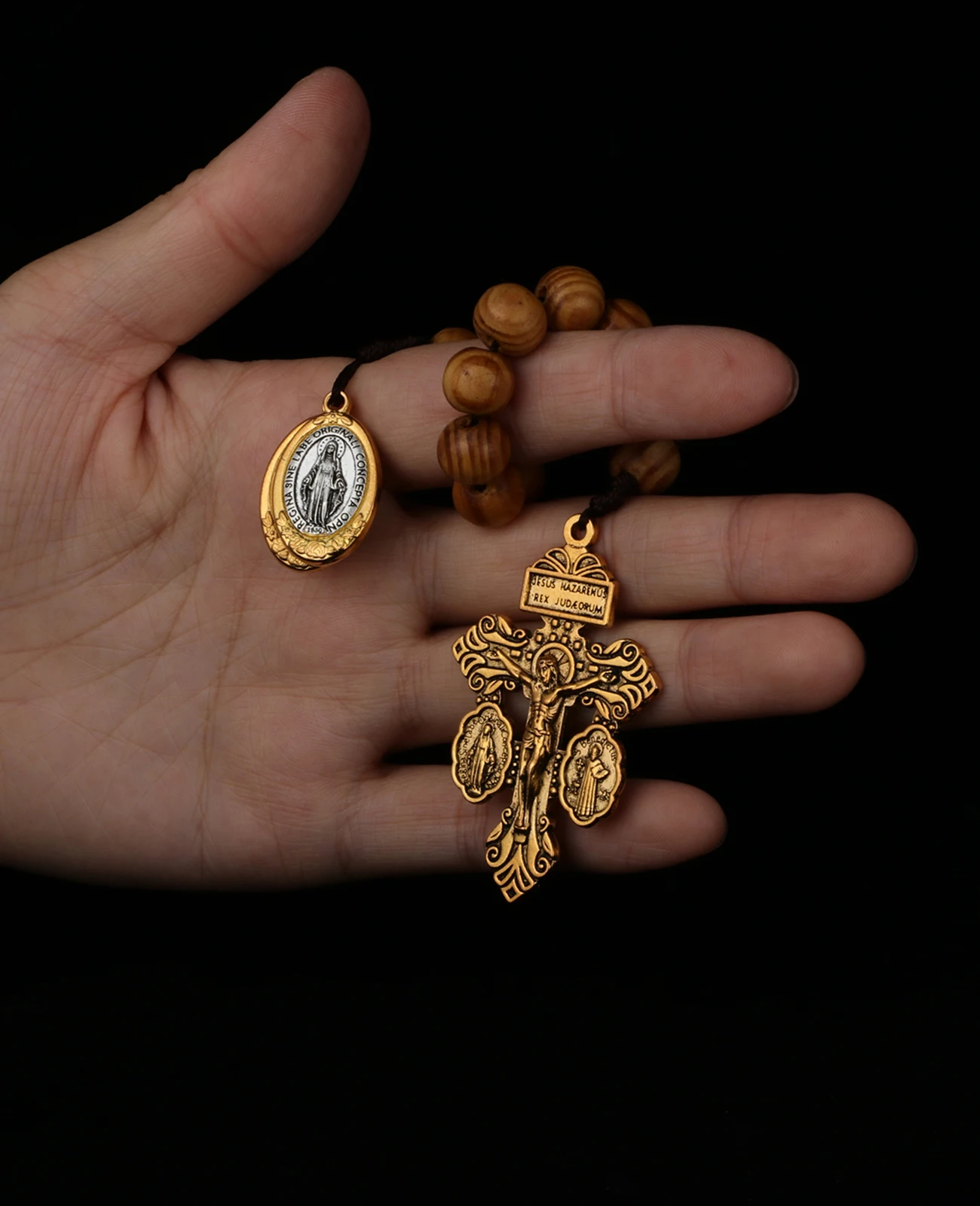 Featuring a St. Benedict medal and Lady Milagrosa crucifix, it embodies Catholic symbolism and faith.