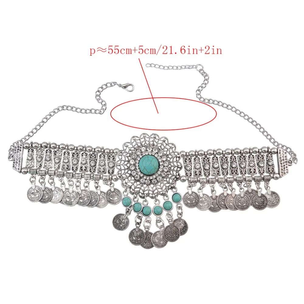 Product:Gypsy Boho Coins Tassel Necklace Red Stone Turquoise Bead Crystal Flower Collares Chokers India Afghan Female Statement Jewelry