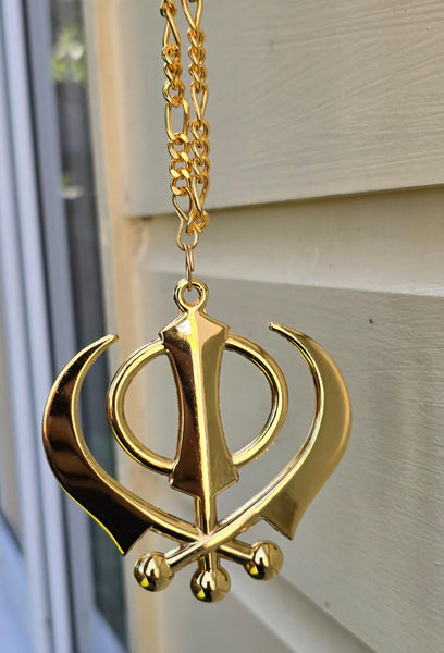 Gold Plated Punjabi Sikh Large Khanda No Stones Stunning Pendant Car Rear Mirror - Brilliant Finish