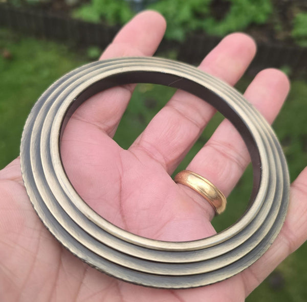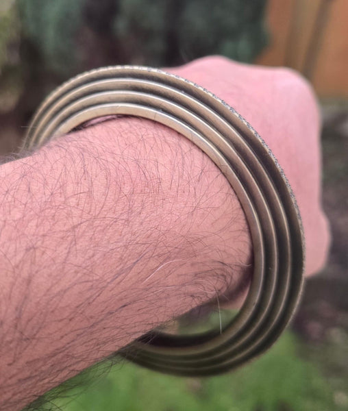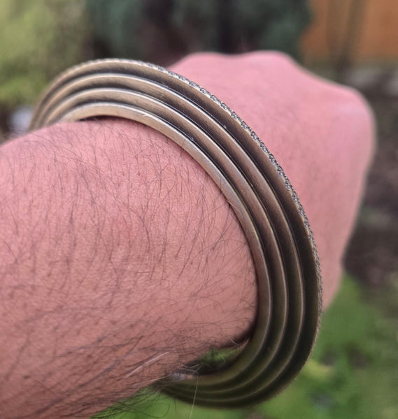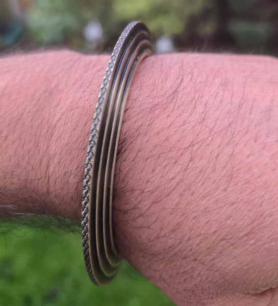 This Sikh Kara Chakri Antique Gold Colour Singh Kada Kaur lines design with ridged edge punjabi bangle N32 is a stylish and meaningful piece of jewellery for any Sikh individual. Made from steel alloy with an Antique Gold colour finish, the bangle features intricate designs inspired by Sikh culture and tradition. Perfect for various occasions such as weddings, anniversaries, and birthdays, this bangle is a beautiful and unique accessory that can be worn by both men and women. The nickel-free metal ensures durability and comfort, making it a versatile and timeless piece for any jewellery collection.