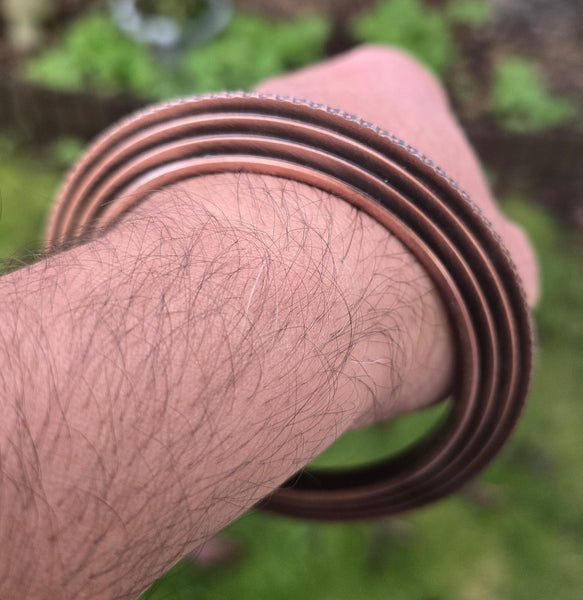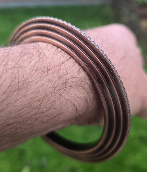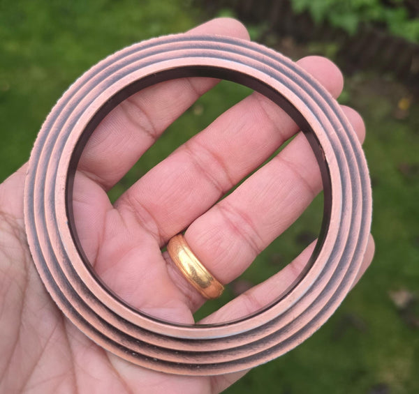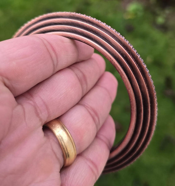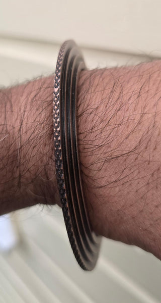This Sikh Kara Chakri Antique Copper Colour Singh Kada Kaur lines design with ridged edge punjabi bangle N31 is a stylish and meaningful piece of jewellery for any Sikh individual. Made from steel alloy with a copper colour finish, the bangle features intricate designs inspired by Sikh culture and tradition. Perfect for various occasions such as weddings, anniversaries, and birthdays, this bangle is a beautiful and unique accessory that can be worn by both men and women. The nickel-free metal ensures durability and comfort, making it a versatile and timeless piece for any jewellery collection.