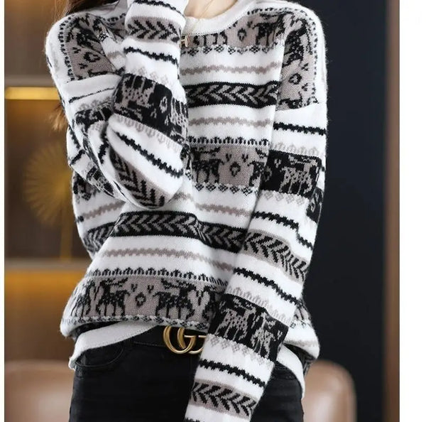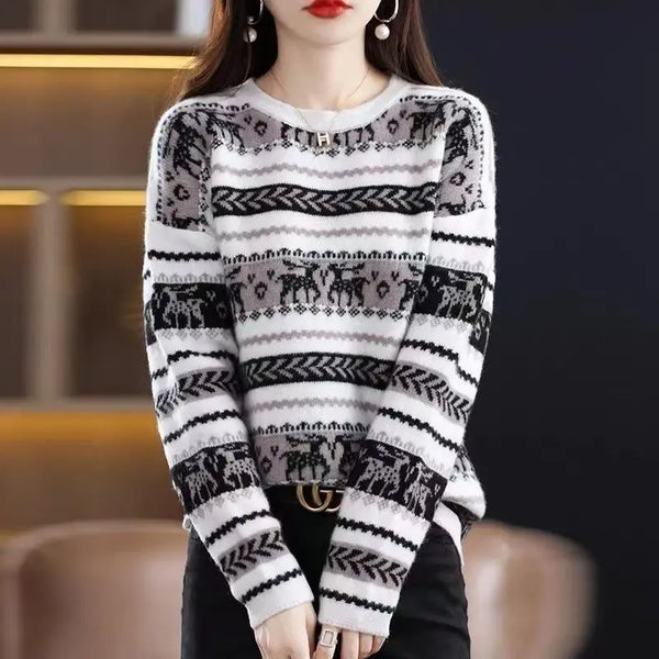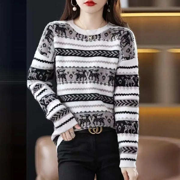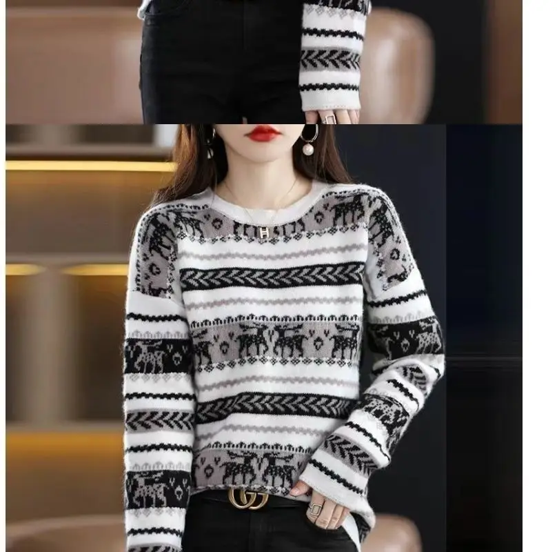 Autumn Winter Women Simple Elk Deer Jacquard Christmas Knitted Sweater Y2K Casual O Neck Long Sleeve Pullover Tops Loose Jumpers