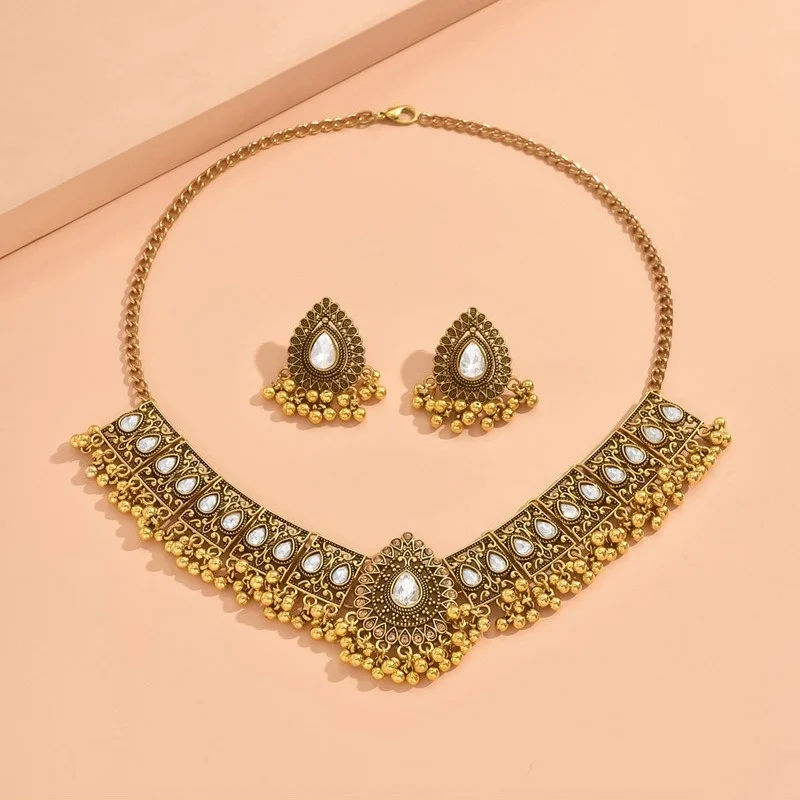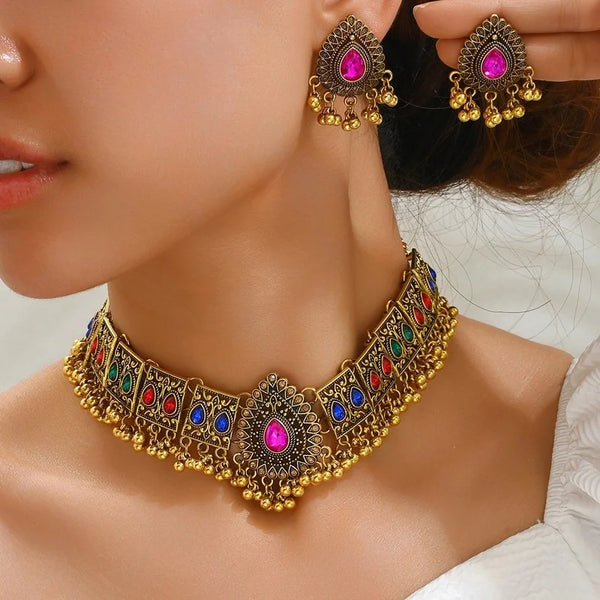 New Fashion Indian Bollywood Traditional Crystal Wedding Temple Choker Necklace Earrings Jewelry Set