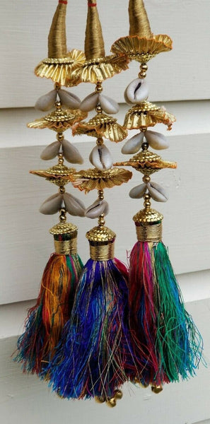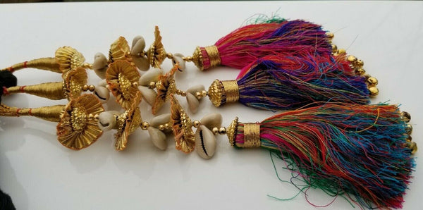 Main Colour - Black, Multicolour and Gold Authentic Paranda from Patiala (Punjab state famous for making traditional Paranda, Nallay and Kaintha/Taweets).Dear ladies,Look like a celebrity and get yourself ready for this festival /Wedding season with these beautiful Braid Tassel hair fashion accessory of ethnic Parande / Parandiś / Doriś hair braids...Punjabi Paranda is one of the ancient ethnic traditional handicrafts of Punjab, the craftsmen require a great deal of patience and creativity while producing the parandaś. They are made out of a bunch of vibrant silk and Zari threads, intricately woven with skillful workmanship. Today Parandaś are now extensively utilised and It has a great cultural appeal on latest trend, owing to its uniqueness and brightness. These Paranda are made in Patiala.These Paranda are ideal for:Any festivals, celebrations and themed Ritual Events like Mayian, Haldi, Mehndi, Jaago, Dholki, and ladies Sangeet Nights. These would make an ideal giveaway accessory to your lovely friends, family and bridesmaids, available in a vast variety of designs and colours for specific occasions.MATERIAL : Long black paranda Braids (Doris) are adored with Beautifully Handcrafted Beaded Mirror And assorted colourful silk threads. Each individual Parandi is finished with beautiful sumptuous embellishments to complete your ethnic attire.QUANTITY : ONE PARANDA with Brass Charm Bells per sale. Please choose quantity from drop down list if you require more. Also available in rainbow of colour selection like:EMERALD GREEN, MAROON, BRILLIANT BLUE, GOLDEN YELLOW, BLACK, TURQUOISE BLUE, MAGENTA PINK, LIME GREEN AND ORANGE.USAGE : Parandaś are hanging tassel braid extensions worn by women in their hair, these are to braided in with your natural hair.SIZE : ( Approximate in cm) Full drop with Braid : approx. 78cm Embellished Silk part : approx. 27cm P.s. Kindly note as these are handmade pieces there might be variations in the embellishments used, and the exact colours may vary slightly from the photos. In addition, we will endeavour to ship this item in the best possible packaging. Colours may vary slightly from the photos. Please check all photos carefully Please contact us if you require any further information