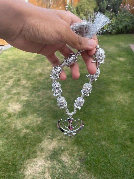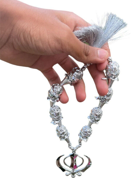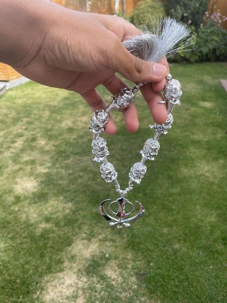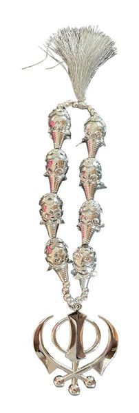 Silver Plated Punjabi Sikh Large Khanda Pendant Car Hanging in Faux Beads Mala.