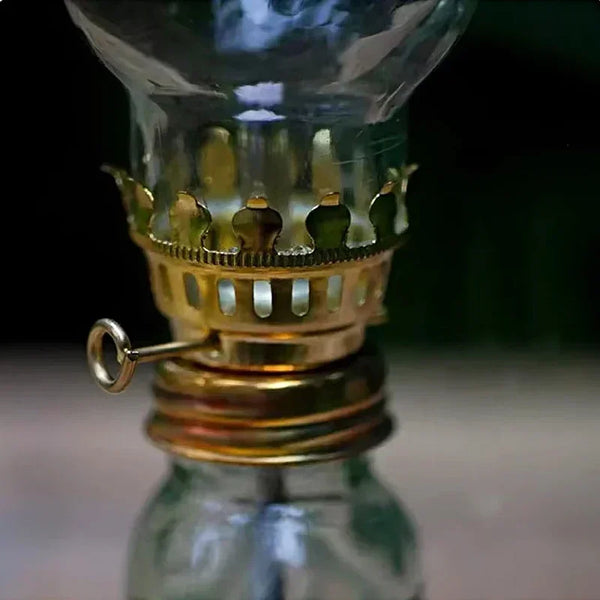 Usually, cotton cord wicks are used, the lamp head is made of copper, and the lamp holder and windproof tube are made of glass. There are multiple claws around the lamp head, and there is a small gear next to it that can control the rise or fall of the cotton rope. By adjusting the position of the cotton rope, the flame size can be controlled, thereby adjusting the brightness. Fill the lamp holder with kerosene, and the cotton rope uses capillary action to suck the kerosene onto the rope head, igniting the rope head to illuminate.