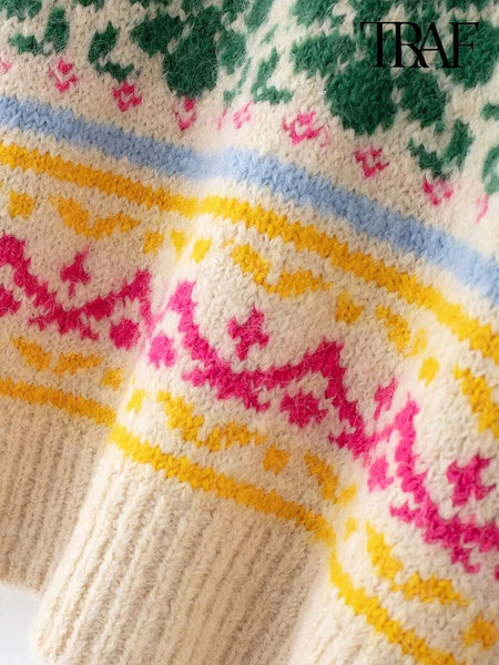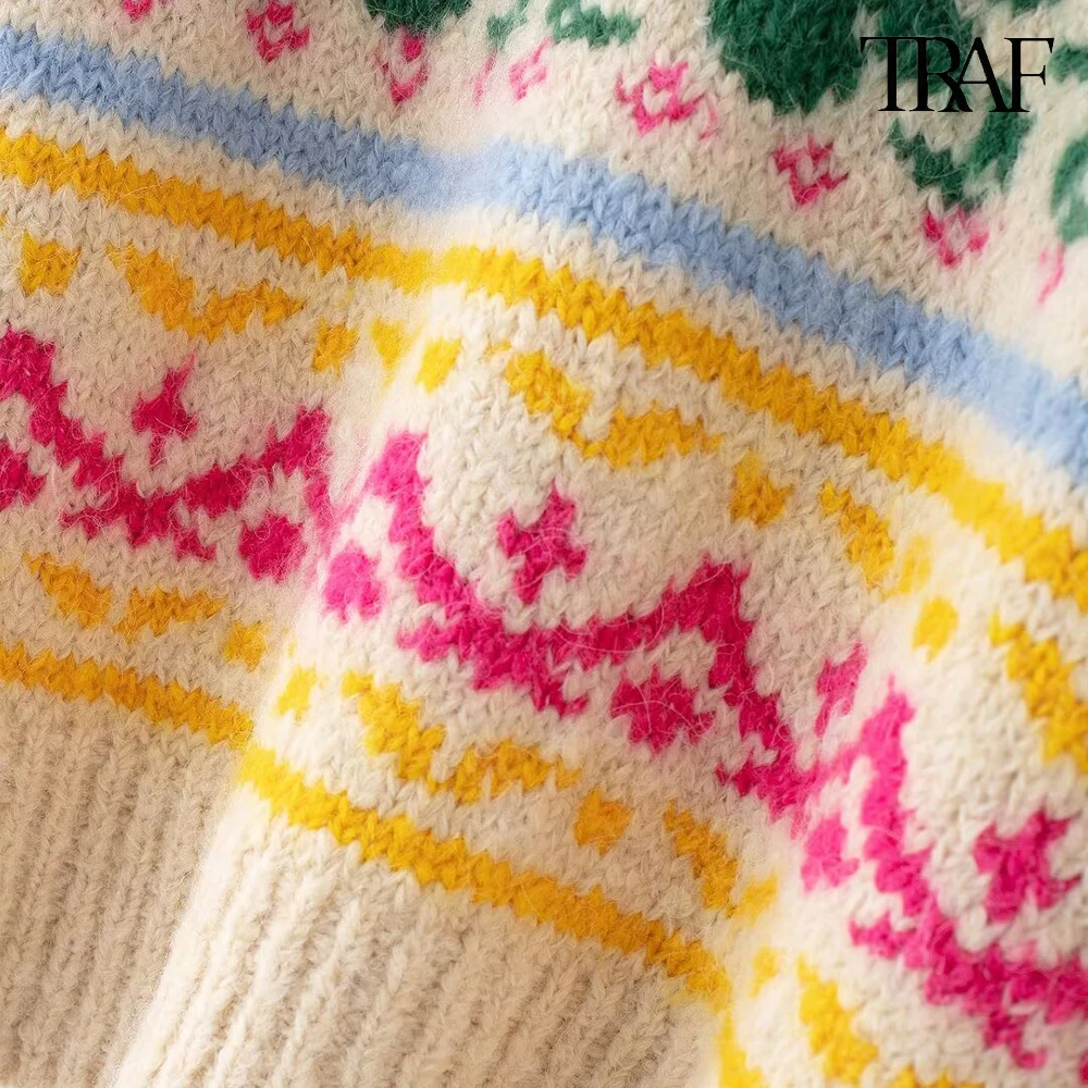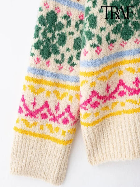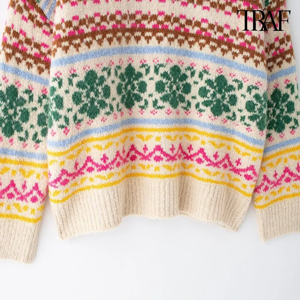 TRAF Women's Fashion 2024 Autumn and Winter Casual Loose Long Sleeve Round Neck Color-Collision Jacquard Knit Christmas Sweater