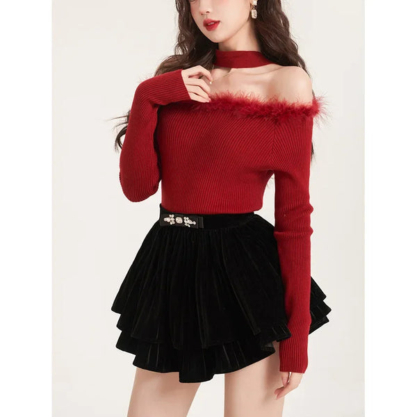 Christmas Theme Splice Design Show Shoulder Knitted Top Winter Hot Sale Of The Season One Shoulder Hanging Neck Slim Fit Body He