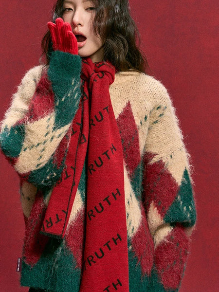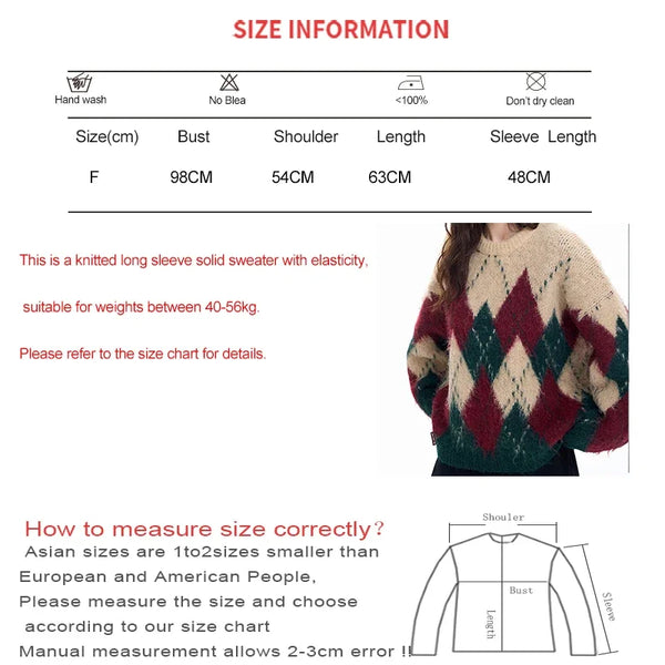 Spliced Christmas Hot Red Diamond Grid Top Checkered Round Neck Knit Long Sleeve Retro Sweater Women Street Design Loose Casual
