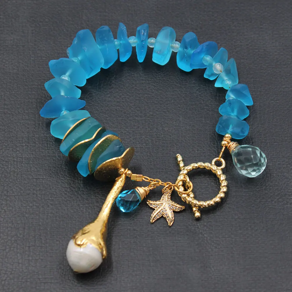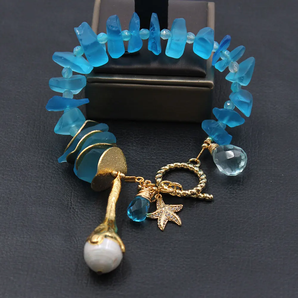 GG Natural Blue Glass Quartz Electroplate Gold Color Plated Keshi Pearl Bracelet CZ Starfish Charms Handmade For Women