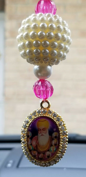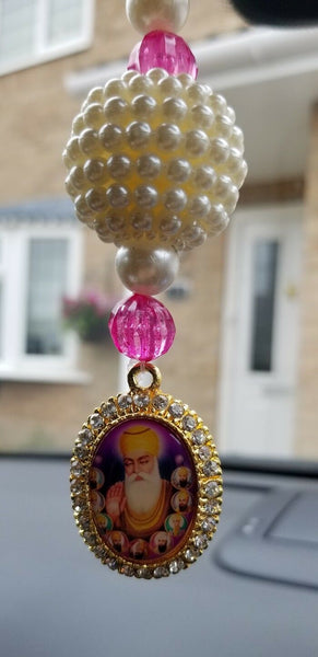 Gold Plated Sikh Ten Gurus Guru Nanak Ji Pendant Punjabi Sikh Kaur Singh Stunning Pendant for Car Rear Mirror with white/transparent beads mala and a Beads ball hanging as shown in photos - Theme Pink