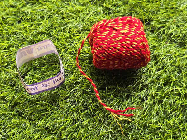 * Normally tied around the wrist of family members on auspicious occasions and around Sadhana items.