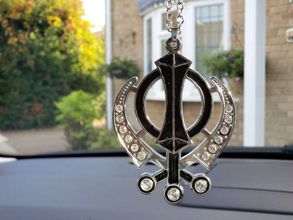 Singh Kaur Sikh Punjabi Silver Plated Black Khanda Pendant Car Rear Mirror Hanging